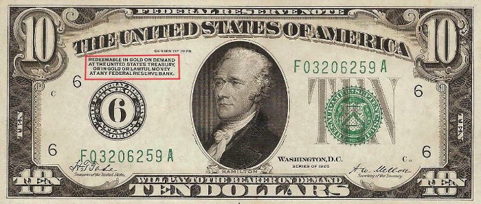 Before this time you could trade your paper currency for gold or silver money. In fact, as you see above on the $10 bill from 192819, it says (highlighted in red), “Redeemable in gold on demand at any United States treasury or in gold or lawful money at any Federal Reserve bank.” There is a very interesting thing about this statement: “redeemable in… lawful money.” A thinking person could legitimately ask, “Wait, if this is saying I can trade it in for lawful money, is this saying that this paper is not lawful money?”